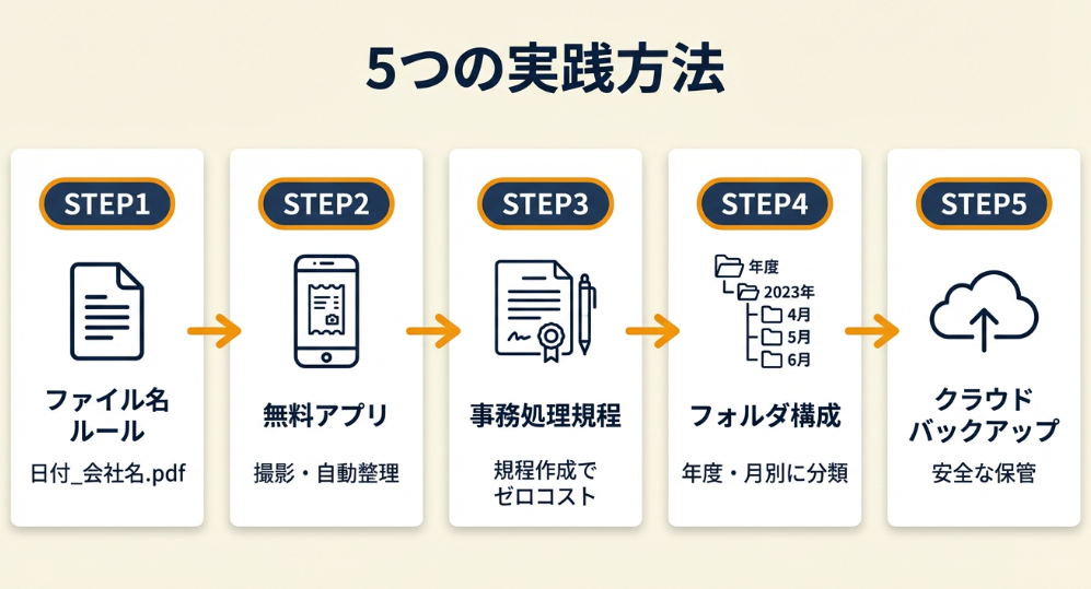 電子帳簿保存法への対応は、最初の仕組みづくりさえ完了すれば、日々の作業は5分程度で済みます。今日中に「ファイル名ルールの決定」と「保存フォルダの作成」の2つを完了させてください。
