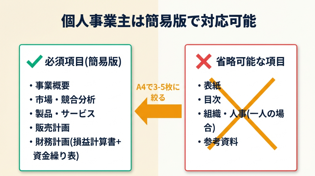 個人事業主やフリーランスの場合、9項目すべてを詳細に作成する必要はありません。A4で3-5枚の簡易版でも、融資審査で十分に通用します。中小企業基盤整備機構の創業計画書ガイドでも、個人事業主向けには簡易版の活用が推奨されています。