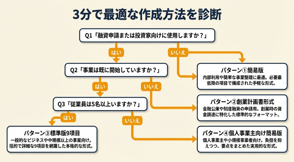 - いいえ → 【パターン②】創業計画書形式で作成