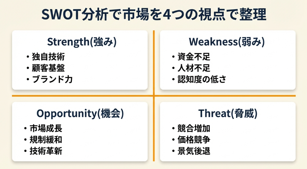 【なぜ効くのか】市場分析は情報が膨大で、どこまで調べればいいか迷いがちです。SWOT分析は4つの観点に絞ることで、必要最低限の情報だけを整理でき、読み手にも伝わりやすくなります。