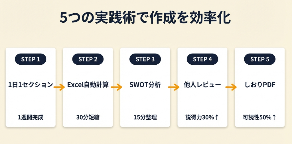 【なぜ効くのか】事業計画書は一度に全体像を把握しながら書くのが難しいため、項目ごとに集中して仕上げる方が質が高くなります。また、1日寝かせることで、翌日に前日の内容を客観的に見直せる効果もあります。