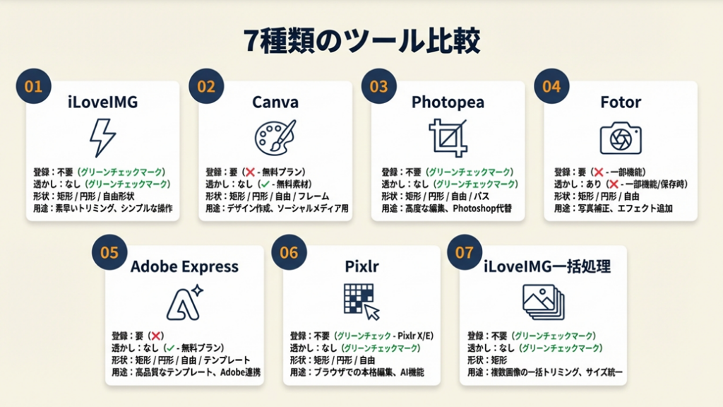 以下の7ツールは登録不要〜登録あり、透かしの有無、対応形状がそれぞれ異なります。自分の優先条件を1つ決めてから選ぶと迷いが消えます。