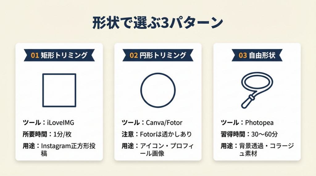 「正方形に切りたい」「円形で切りたい」「人物だけ残したい」は、使うツールがそれぞれ異なります。形状から逆引きすると選択ミスがなくなります。