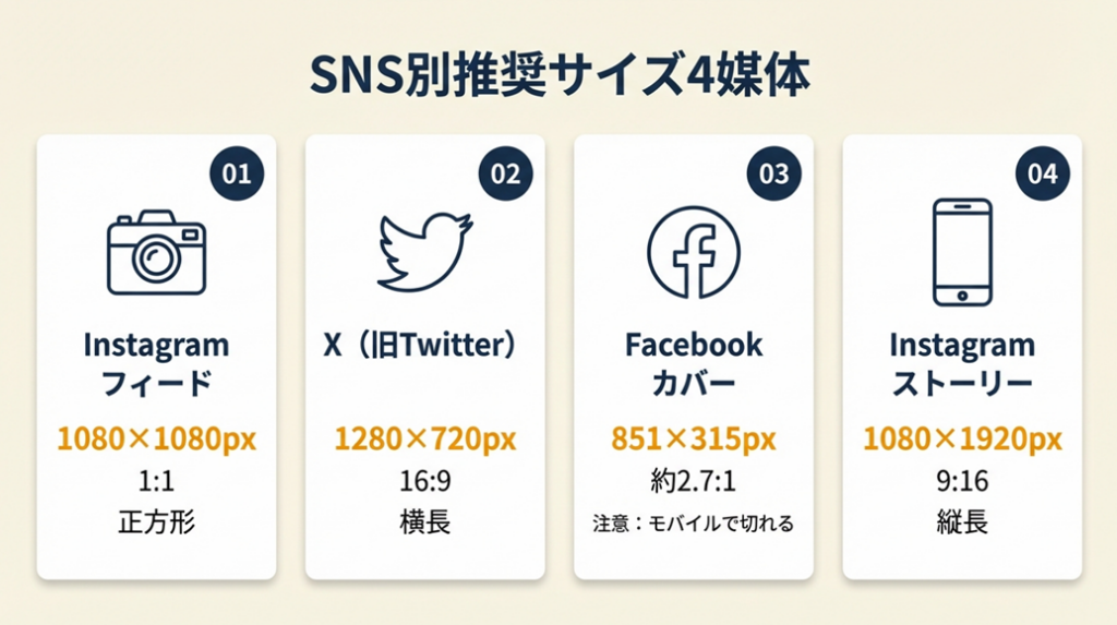 | Instagram フィード | 1080×1080px | 1:1 | 縦長は4:5(1080×1350px)も対応 |