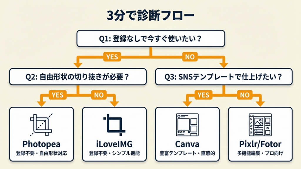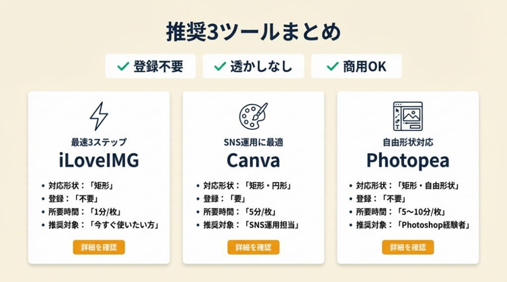 登録不要で透かしなしという条件を両方満たすのはiLoveIMGとPhotopeaの2択です。「まず試したい」フェーズではiLoveIMG、「自由形状まで必要」な場合はPhotopeaが選択肢になります。