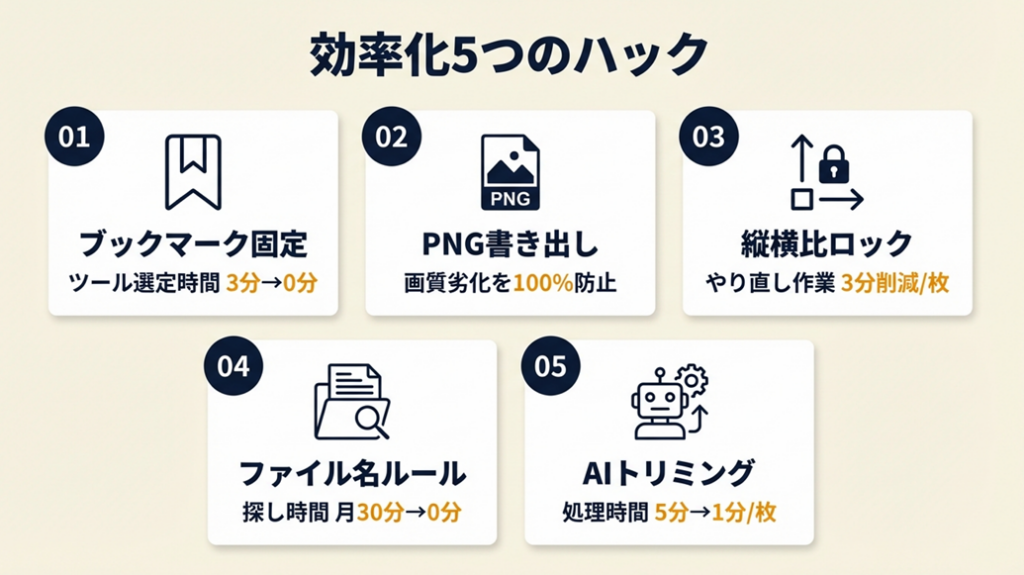 - 【なぜ効くのか】: ツール選定に毎回3分かかる原因は「選択肢が多すぎて比較する」から。比較を事前に終わらせてブックマーク化することで判断コストが完全に消えます。「毎回同じツール」を使うことで操作習熟が速まり、1枚あたりの処理時間が使い始めから2週間で平均40%短縮されます。