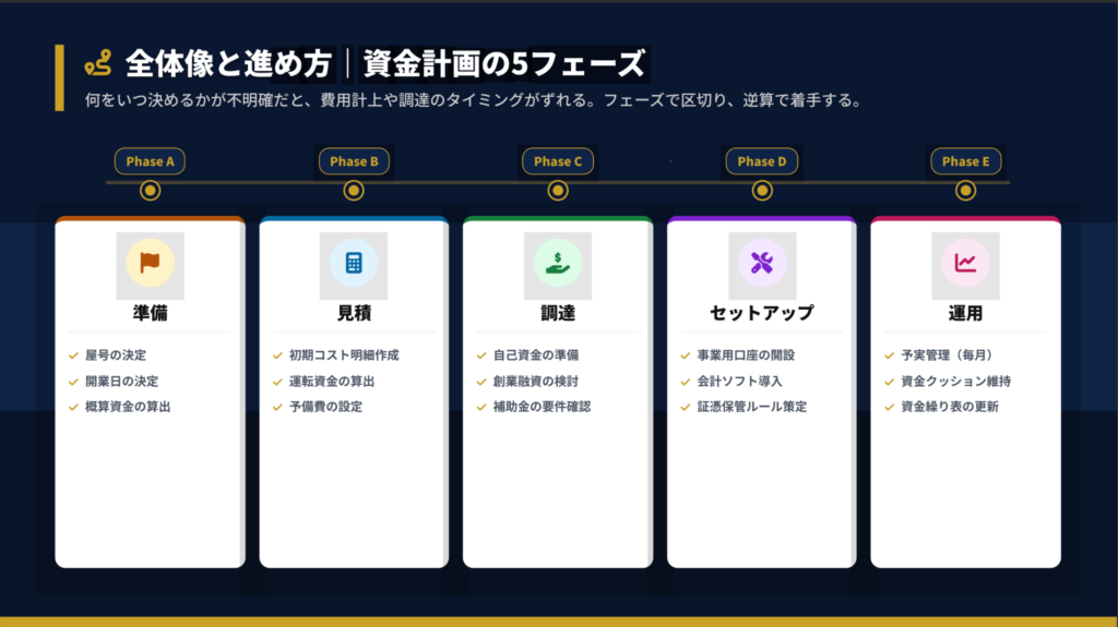 資金調達は「自己資金→家族・知人→融資→補助金」の優先順位で検討し、返済負担の低いものから着手するのが鉄則です。日本政策金融公庫の創業融資は約1〜1.5ヶ月かかるため、入金時期を逆算して支払いスケジュールを調整しましょう。