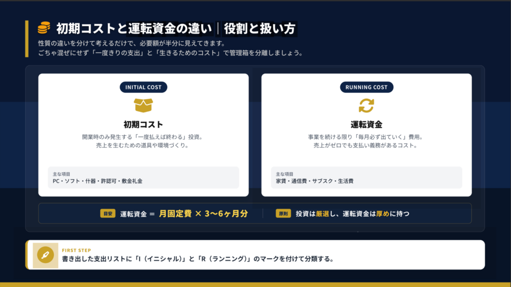 初期コストと運転資金はそれぞれ性質が異なるため、混同せずに「管理箱を分ける」という発想が重要です。初期コストは開業時のみ発生するPC・ソフト・許認可費用などの投資であり、運転資金は家賃・通信費・サブスク・生活費など売上がゼロでも毎月出ていくコストを指します。