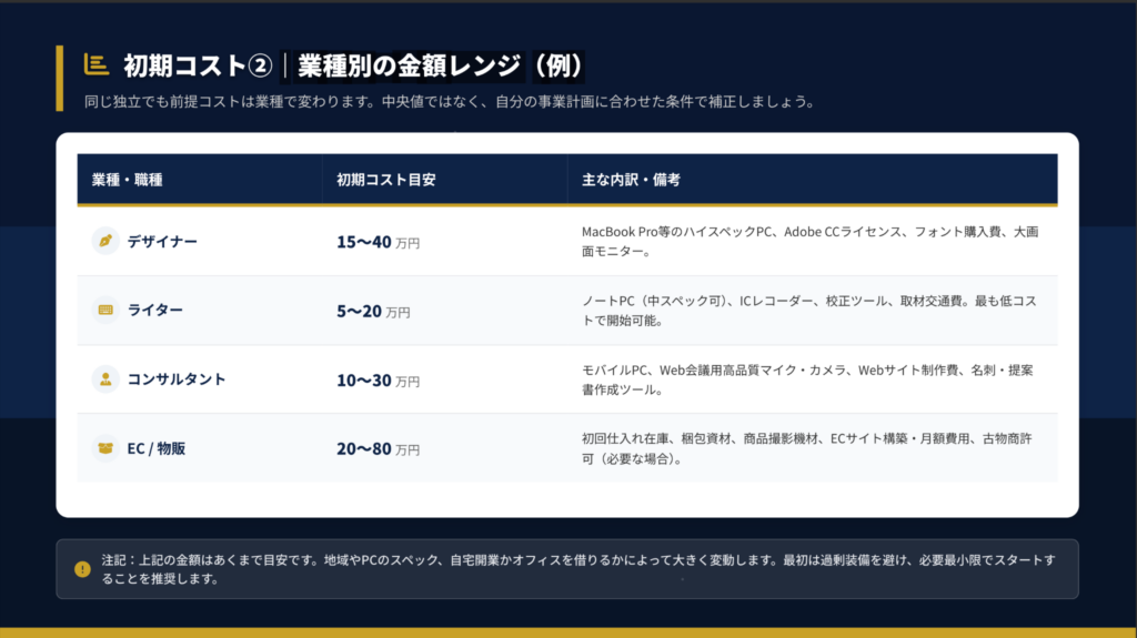 「同業者はどれくらいの資金で始めているのだろう」と気になりますよね。同じ独立でも前提コストは業種によって大きく異なります。