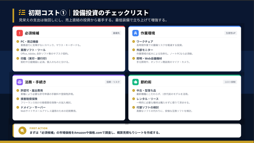 設備投資は「売上直結の投資」から着手し、見栄えの支出は後回しにするのが鉄則です。具体的には、PC・業務ソフト・印鑑が必須候補であり、ワークチェアや外部モニターは生産性向上のための二次投資、損害賠償保険やドメイン取得は信頼構築のための三次投資と位置づけます。