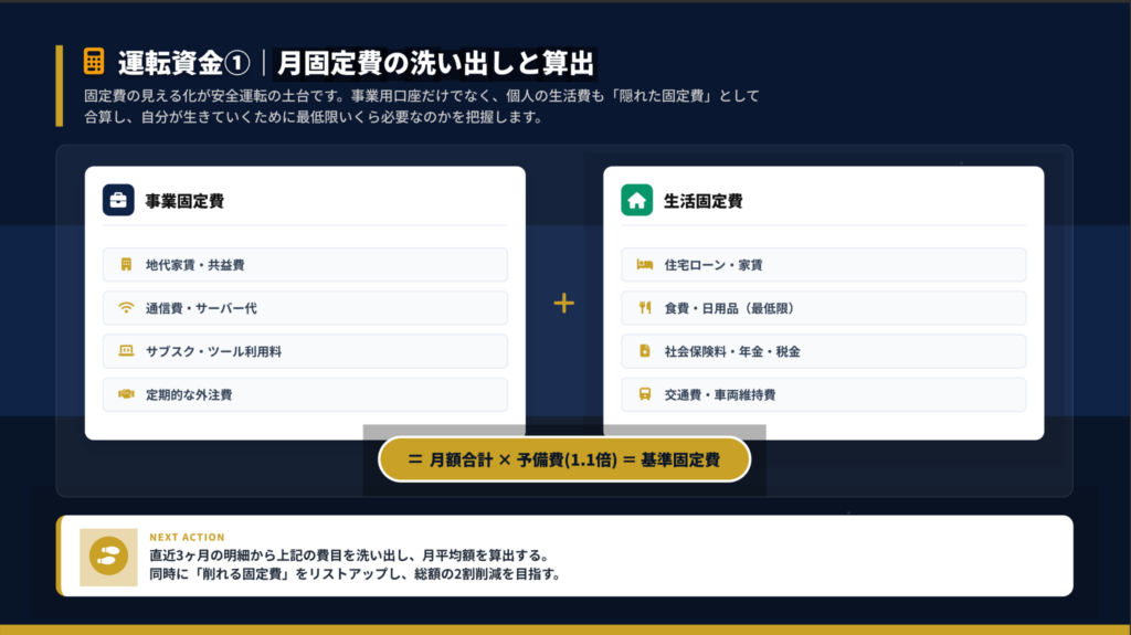 固定費の見える化が安全運転の土台です。事業固定費(地代家賃・通信費・サブスク・外注費)と生活固定費(住宅ローン・食費・社会保険料・交通費)を合算し、さらに予備費として1.1倍した金額が「基準固定費」となります。