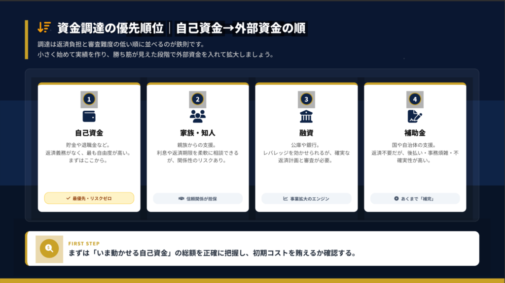 資金調達の優先順位は「自己資金→家族・知人→融資→補助金」の順です。小さく始めて実績を作り、勝ち筋が見えた段階で外部資金を入れて拡大しましょう。