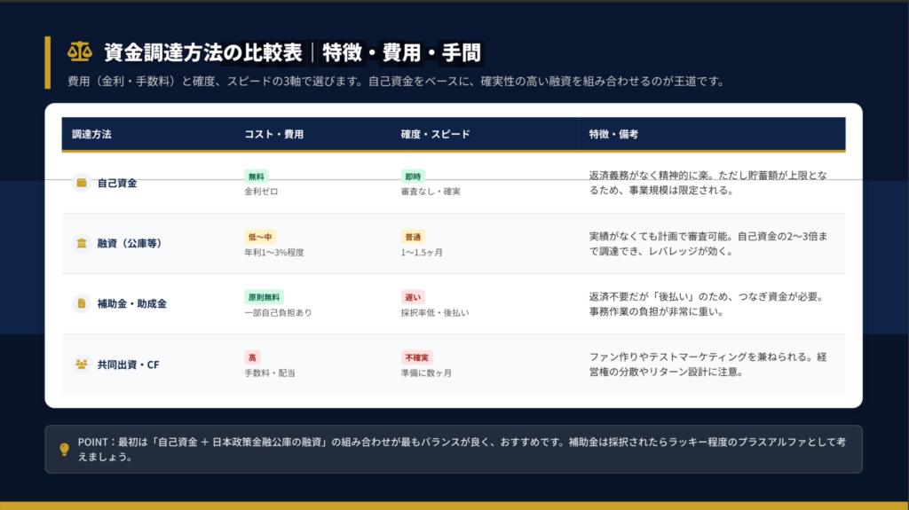 個人的には、最初は「自己資金+日本政策金融公庫の融資」の組み合わせが最もバランスが良いと考えています。補助金は採択されたらラッキー程度のプラスアルファとして位置づけてください。