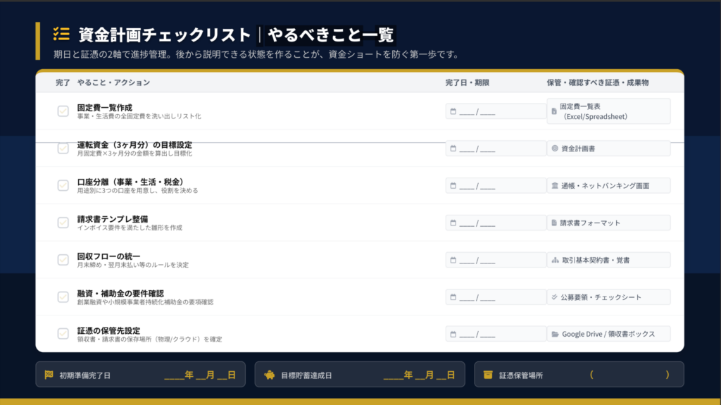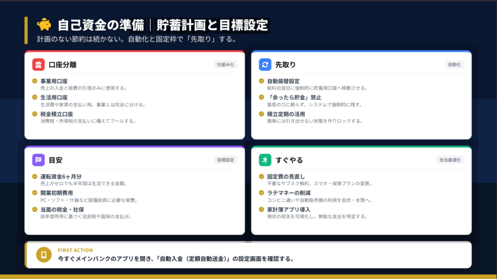 含めるべきです。事業用口座だけでなく、個人の生活費も「隠れた固定費」として合算し、自分が生きていくために最低限いくら必要かを把握してください。生活費を無視した資金計画は机上の空論になりがちです。