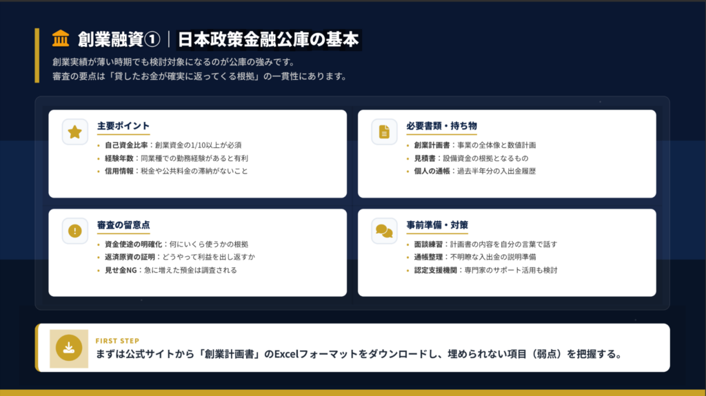 創業実績が薄い時期でも検討対象になるのが公庫の強みです。審査の要点は「貸したお金が確実に返ってくる根拠」の一貫性にあります。主要な審査ポイントは自己資金比率(創業資金の1/10以上)、同業種での勤務経験、税金や公共料金の滞納がないことの3点です。