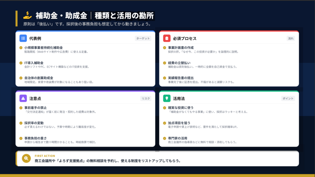 補助金活用には「後払い」「事前着手禁止」「採択率変動」という3つの原則を理解しておく必要があります。代表的な補助金としては、小規模事業者持続化補助金(販路開拓向け)、IT導入補助金(会計ソフトやPC向け)、自治体の創業助成金(家賃や改装費向け)があります。