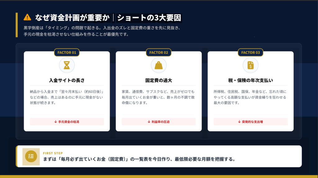 黒字倒産は「タイミング」の問題で起きます。入金サイトの長さ(翌々月末払い等)、固定費の過大、税・保険の年次支払いがショートの3大要因です。これらを先に見抜き、手元の現金を枯渇させない仕組みを作ることが最優先となります。