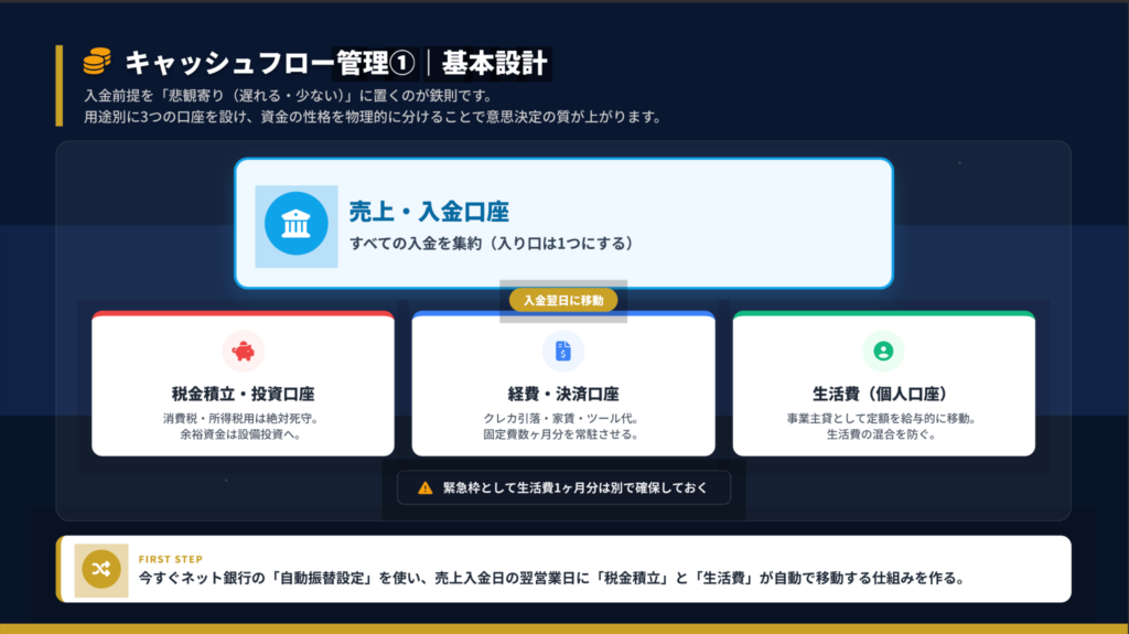 用途別に3つの口座を設け、資金の性格を物理的に分けることで意思決定の質が上がります。売上・入金口座にすべての入金を集約し、入金翌日に「税金積立・投資口座」「経費・決済口座」「生活費(個人口座)」へ自動振替する仕組みを構築してください。