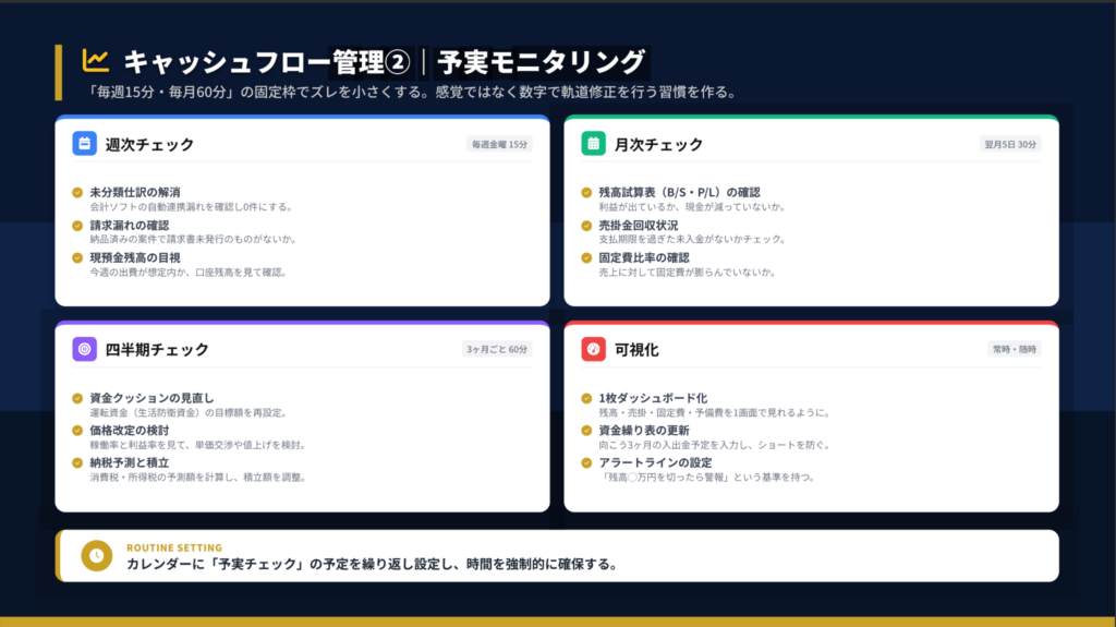 カレンダーに「予実チェック」の予定を繰り返し設定し、時間を強制的に確保することが継続の秘訣です。残高・売掛・固定費・予備費を1画面で見られるダッシュボードを作成すると、チェックの習慣化がしやすくなります。