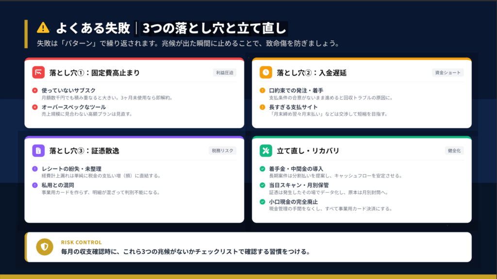 [!] 失敗パターン1: 固定費高止まり(利益圧迫) 使っていないサブスクが月額数千円でも積み重なると大きな負担になります。3ヶ月未使用なら即解約してください。また、売上規模に見合わない高額プランは見直しが必要です。