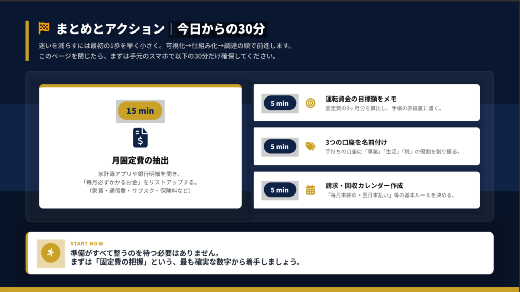 準備がすべて整うのを待つ必要はありません。まずは「固定費の把握」という最も確実な数字から着手することで、漠然とした不安が具体的な行動計画に変わります。迷いを消して、安全に、確実に前進しましょう。