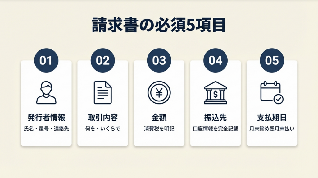 押さえるべき項目は5つだけです。この5項目さえ揃えれば、実務上の請求書として機能します。