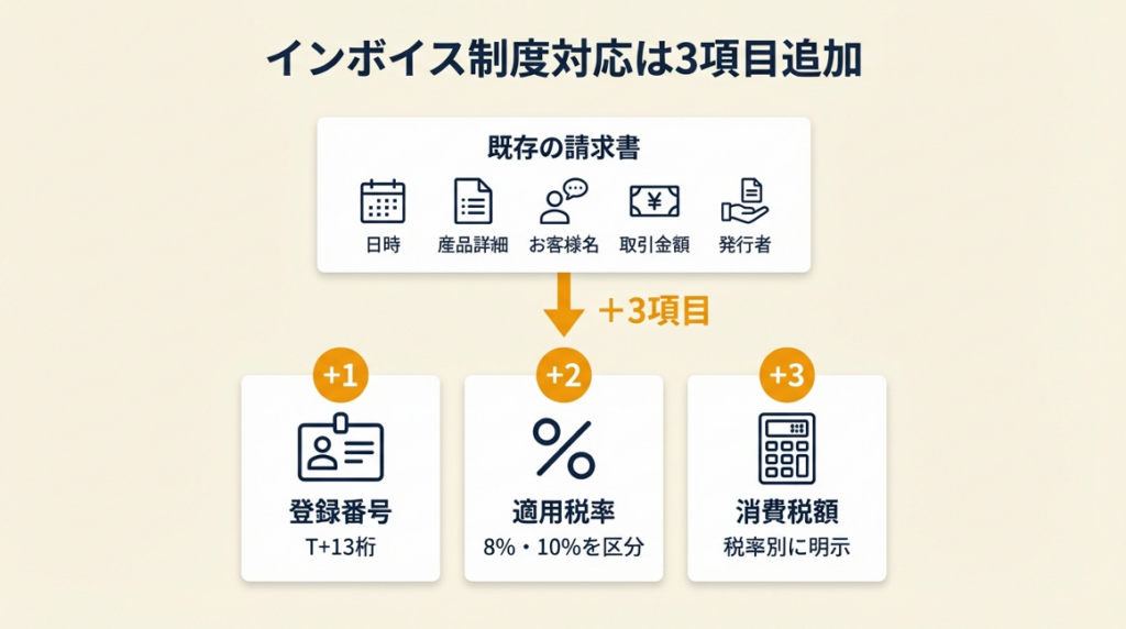 既存の請求書に「登録番号・適用税率・税率別消費税額」の3点を加えれば適格請求書になります(No.6498 適格請求書等保存方式|国税庁)。