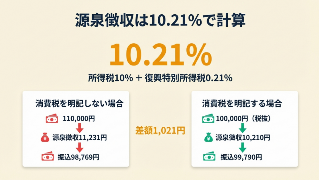 消費税を明記するだけで手取りが約1,000円増えます。年12件の請求であれば年間約12,252円の差になります。消費税を明記することは、インボイス制度対応の観点からも必須であり、源泉徴収の節約にもなる一石二鳥の対策です。