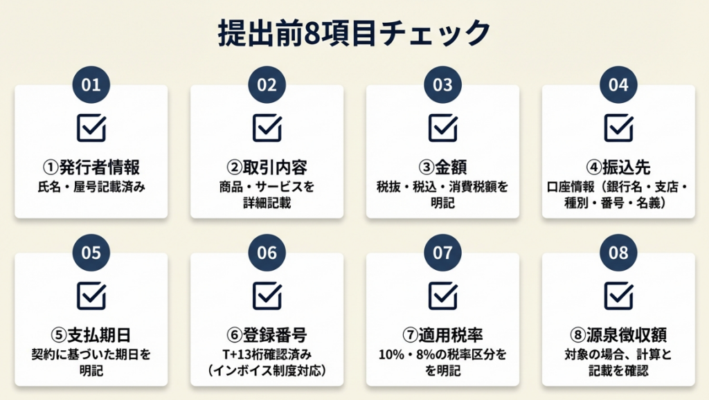 手元の請求書テンプレートを開き、発行者名・取引内容・金額・振込先・支払期日の5項目が揃っているか確認する(所要時間:3分)。