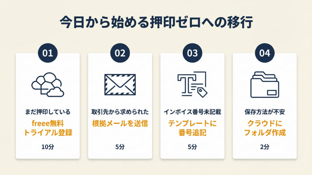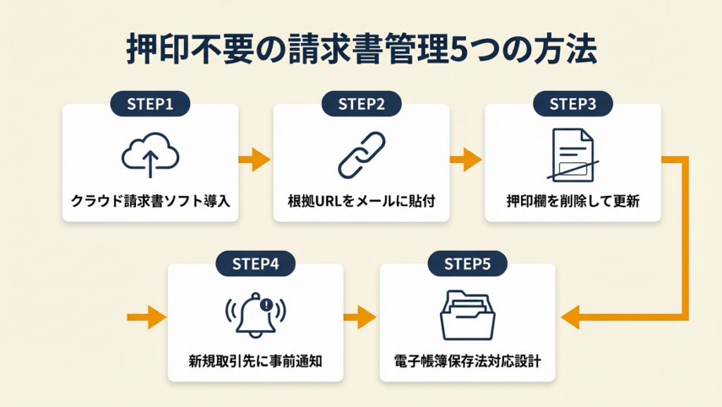 印鑑なしの運用に切り替える際、何から始めればいいか迷う方も多いはずです。以下の5つの方法を実践すれば、押印ゼロの請求書管理が完成します。