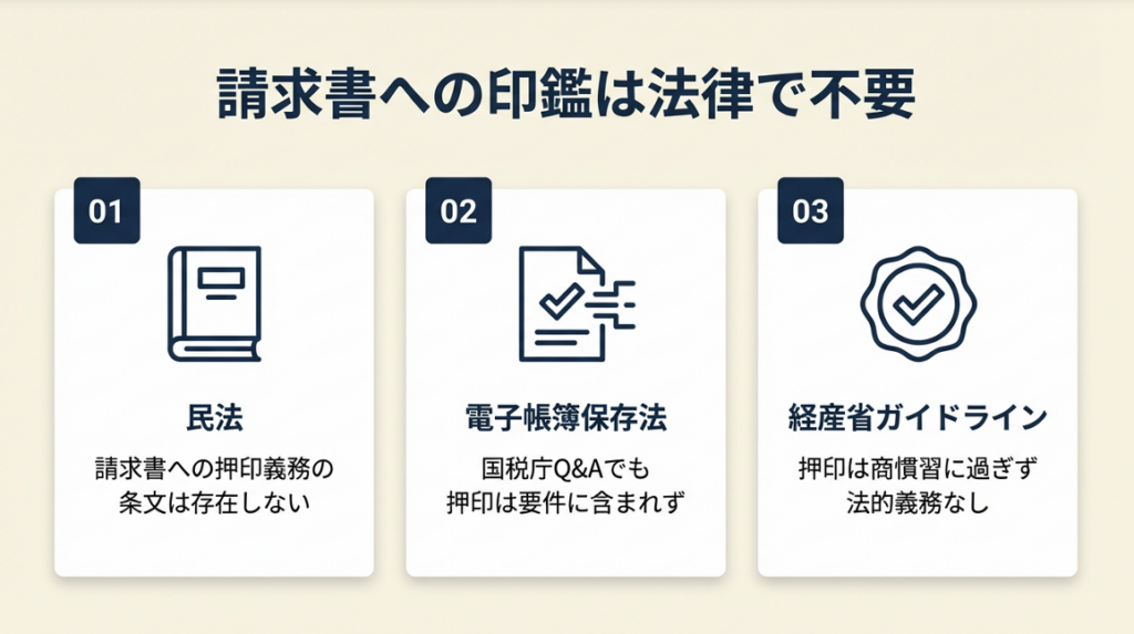 請求書への印鑑は法律上まったく求められていません。根拠は明確で、民法・電子帳簿保存法・経済産業省の3つのいずれにも「押印義務」の規定は存在しません。