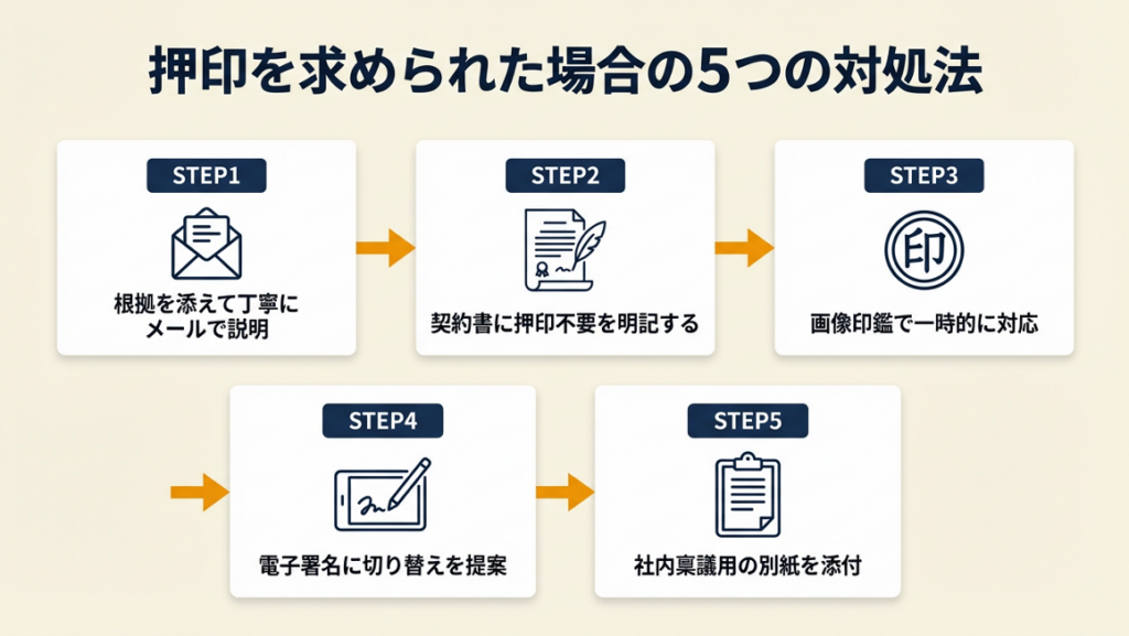 取引先から「請求書に印鑑を押してほしい」と言われた場合、法的に不要とわかっていても関係を壊さずに対応するのは難しいものです。以下の5つの対処法を状況に応じて使い分けてください。