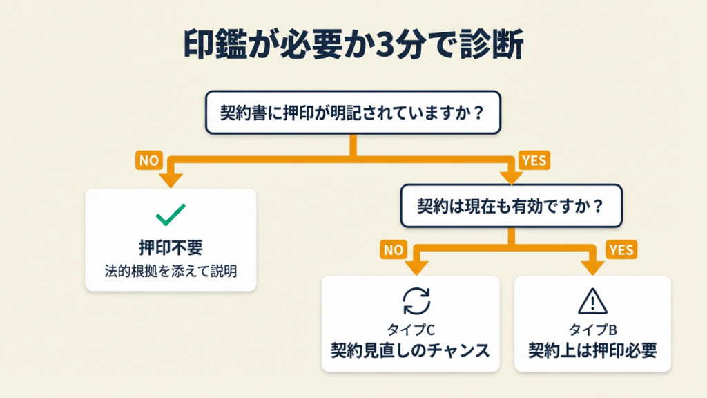 - No → タイプA:押印不要。法的根拠を添えて取引先に説明してください。