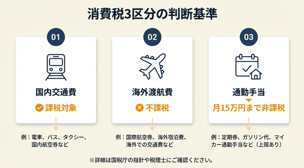 旅費交通費の消費税区分は、国内か海外か、そして取引の性質で決まります。