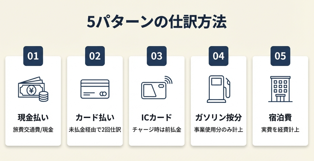 実務で発生する旅費交通費の仕訳は、支払方法や交通手段によって5つのパターンに分類できます。それぞれの具体例を見ていきましょう。