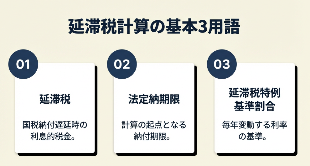 延滞税がどのように発生するのか——この疑問を解消するには、基本となる3つの用語を押さえることが近道です。