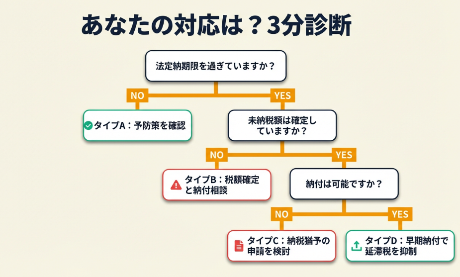 | タイプC | 国税庁ツールで延滞税を計算し、今週中に納付または税務署に分納相談する |