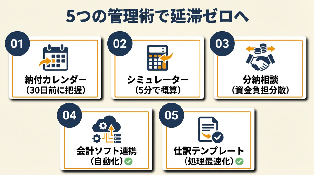 納付カレンダーの作成や会計ソフトとの連携で、そもそも延滞税を発生させない仕組みを構築することが、長期的な負担軽減につながります。