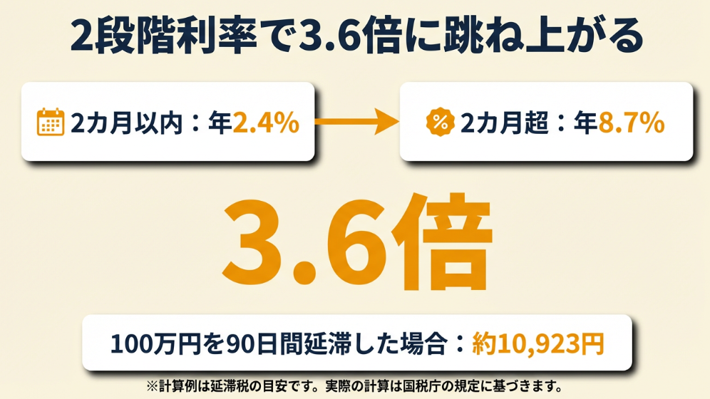 2カ月を経過した翌日以降は、年14.6%と「延滞税特例基準割合+7.3%」のいずれか低い方が適用されます。令和6年(2024年)分では年8.7%です。同じ100万円でも、3カ月目以降は利率が約3.6倍になるため、長期化すると負担が急増します。