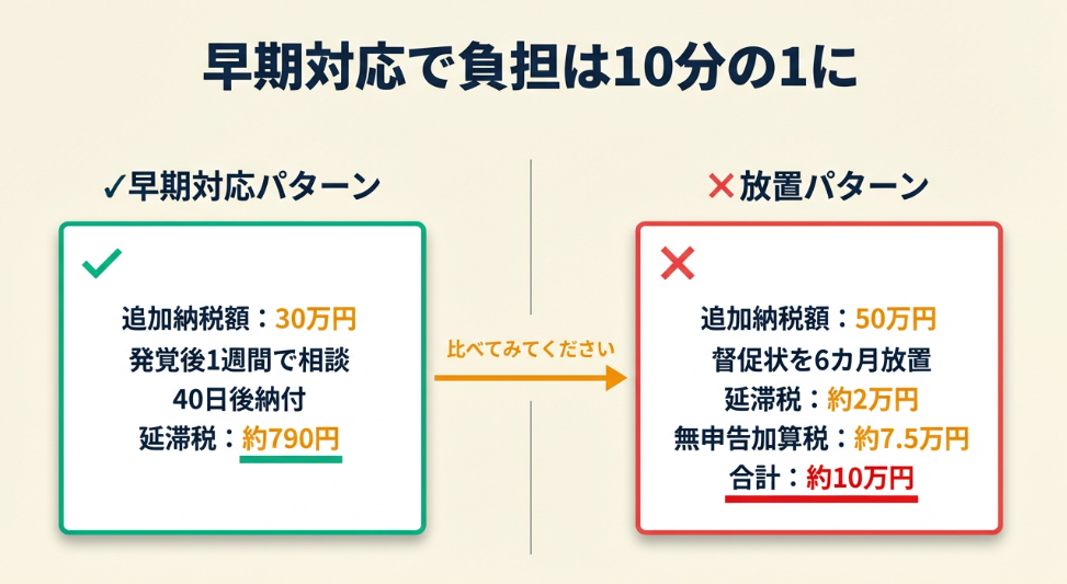 状況: 会社員が副業の確定申告を忘れ、税務署から督促状が届いた。追加納税額は約50万円。