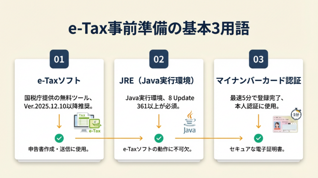 e-Taxの事前準備では3つの用語を押さえてください。これらを理解すれば、インストール作業がスムーズに進みます。