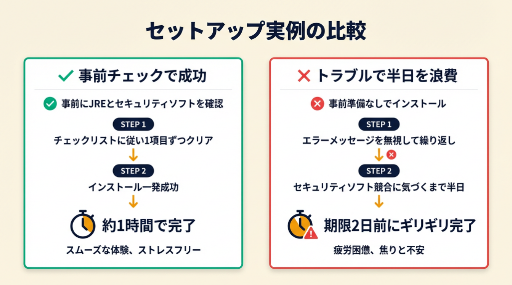 インストールエラーの多くはセキュリティソフト競合またはJREバージョン不整合が原因であり、事前チェックリストで回避できます。確定申告期限は3月15日ですが、事前準備は1月中の完了を推奨します。
