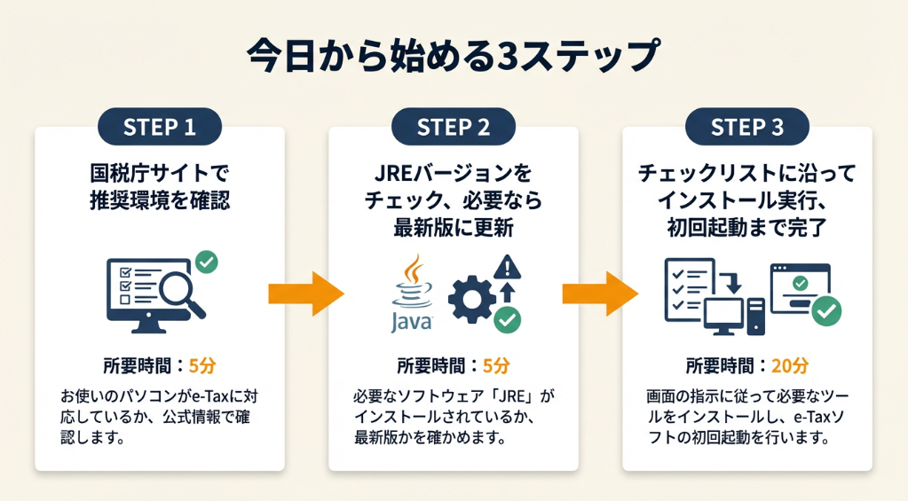 e-Tax利用開始は「いきなりインストール」ではなく「チェックリスト→環境確認→インストール」の順序が成功の鍵です。初回は30分の事前準備に投資することで、その後の申告作業を毎年スムーズに進められます。