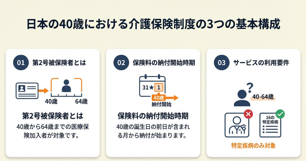 「40歳になったら介護保険料を払うらしいけれど、仕組みがわからない」——よくある悩みです。制度の全体像を第2号被保険者・支払開始時期・特定疾病の3つの観点から整理します。