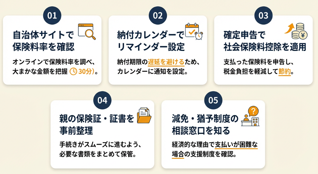 【最初の一歩】 今日中に今年の国民健康保険料決定通知書を探し、介護分の金額を確認してください(10分)。