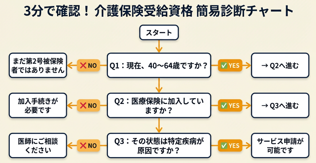「自分は特定疾病に該当するのか」「介護保険サービスを使えるのか」——以下の診断で3分以内に判定できます。