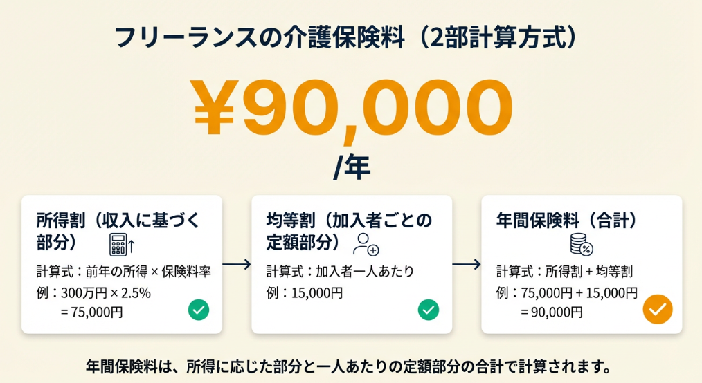 フリーランス・個人事業主が加入する国民健康保険の介護分は、多くの自治体で「所得割」と「均等割」の合計で算出されます。所得割は前年の所得(収入−必要経費−基礎控除等)に介護保険料率を掛けた金額、均等割は加入者1人あたりの定額です(弥生 介護保険料は確定申告で控除の対象?)。