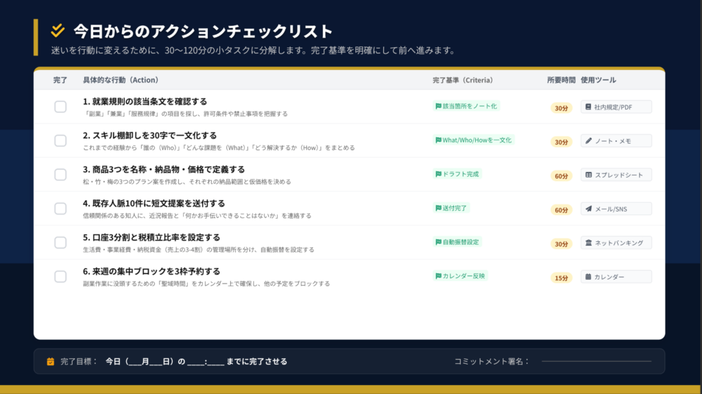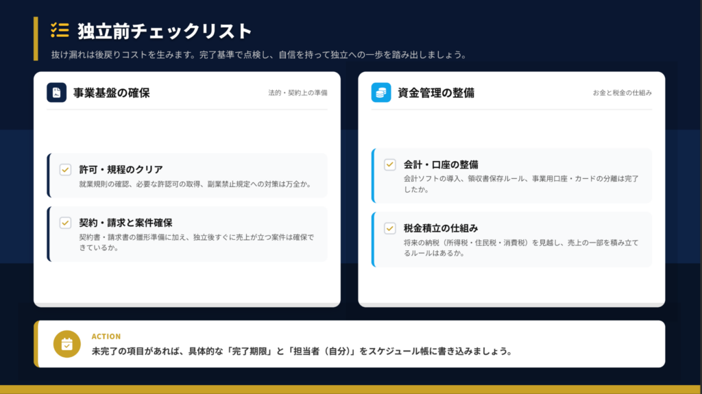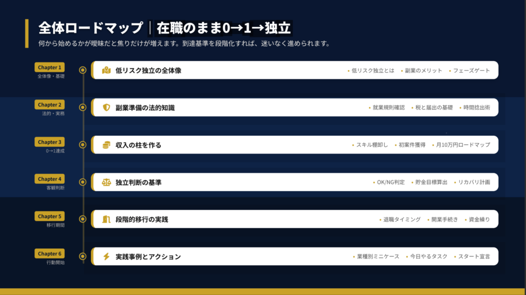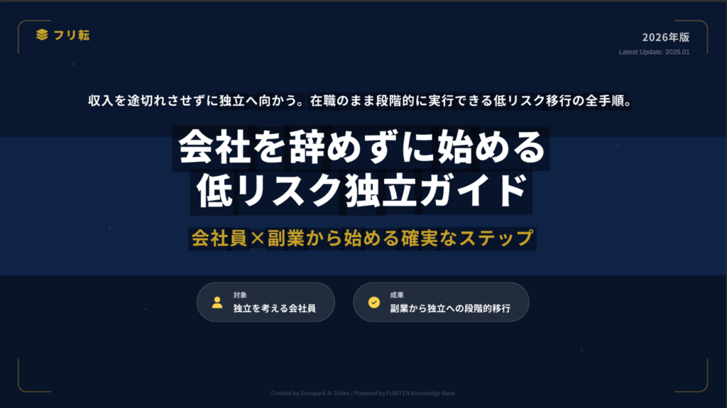本記事は「会社を辞めずに始める低リスク独立ガイド」の内容を元に作成しています。 より詳しい図解・チェックリスト・計算シートは、以下からダウンロードできます。