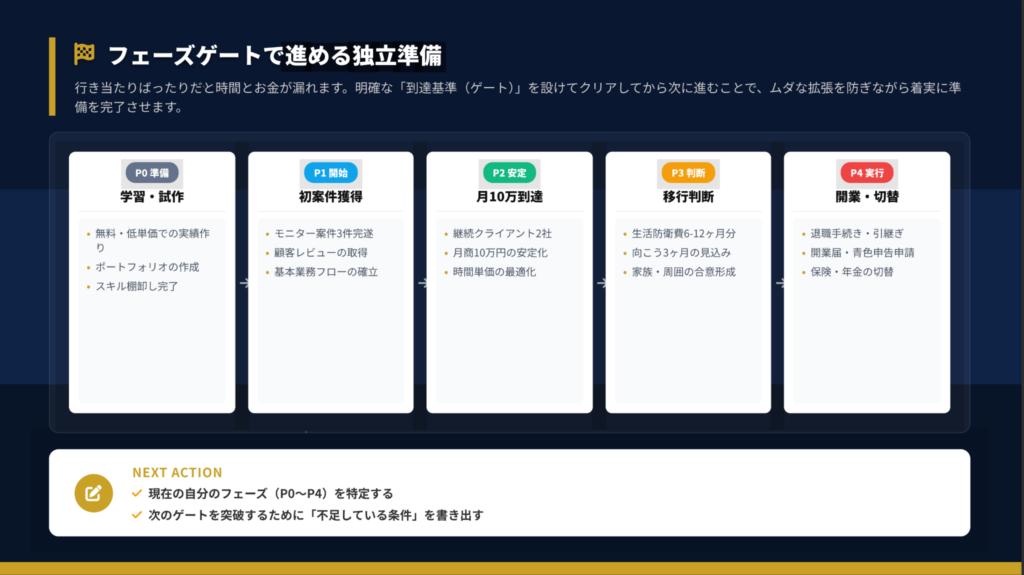 フェーズを飛ばすと、基盤が不安定なまま独立することになり、資金ショートのリスクが高まります。各フェーズには到達基準があるため、全ての条件をクリアしてから次に進むことが重要です。焦らず段階的に進めましょう。
