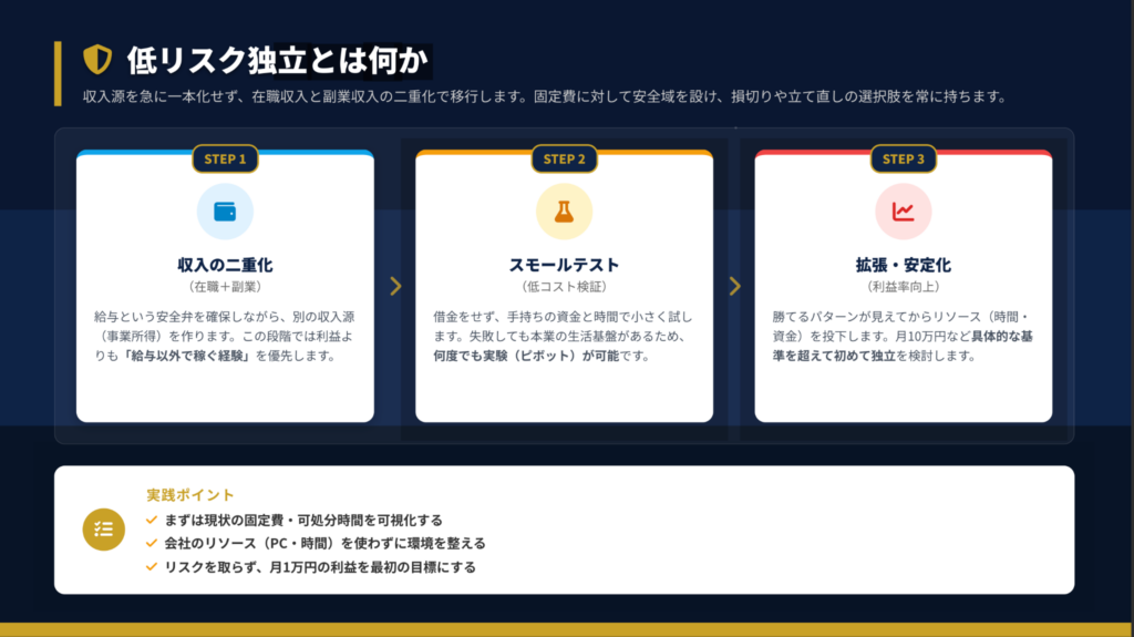 低リスク独立を成功させるための核心は、収入の二重化を維持しながら段階的に移行することです。